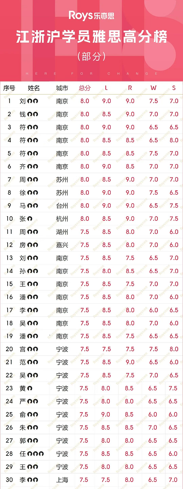 江浙滬的家長和學員們,都深諳“先人一步,贏在起跑線”的道理。早點開始學習,早點拿個高分,這已經成了大家的共識。事實也確實如此,樂亦思在江浙滬地區的學員中,雅思8.0分的大有人在,7.5分以上的有152位,7.0分以上的更是多達517位!