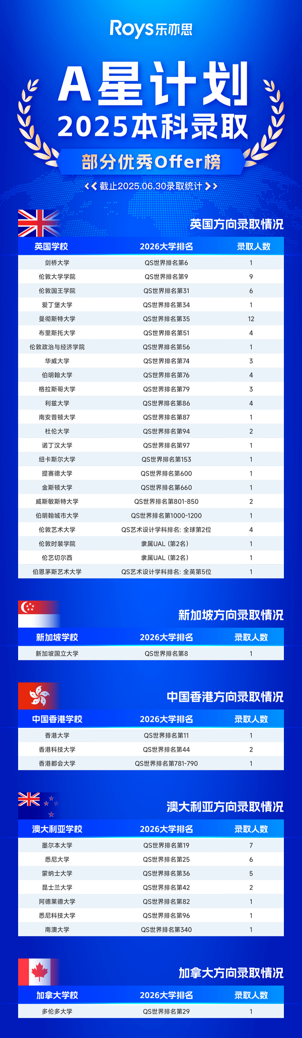 樂亦思A星計(jì)劃,為學(xué)子們量身打造了1.5年制、2年制和2.5年制的陪伴式升學(xué)規(guī)劃服務(wù)。今年,無論是英國(guó)、香港、新加坡,還是澳洲、加拿大的升學(xué)方向,我們都取得了豐碩的成果。港大、劍橋、英國(guó)G5、港科技、新加坡國(guó)立等名校的offer如雪花般飄來,下一封,我們劍指巔峰,期待更多輝煌!