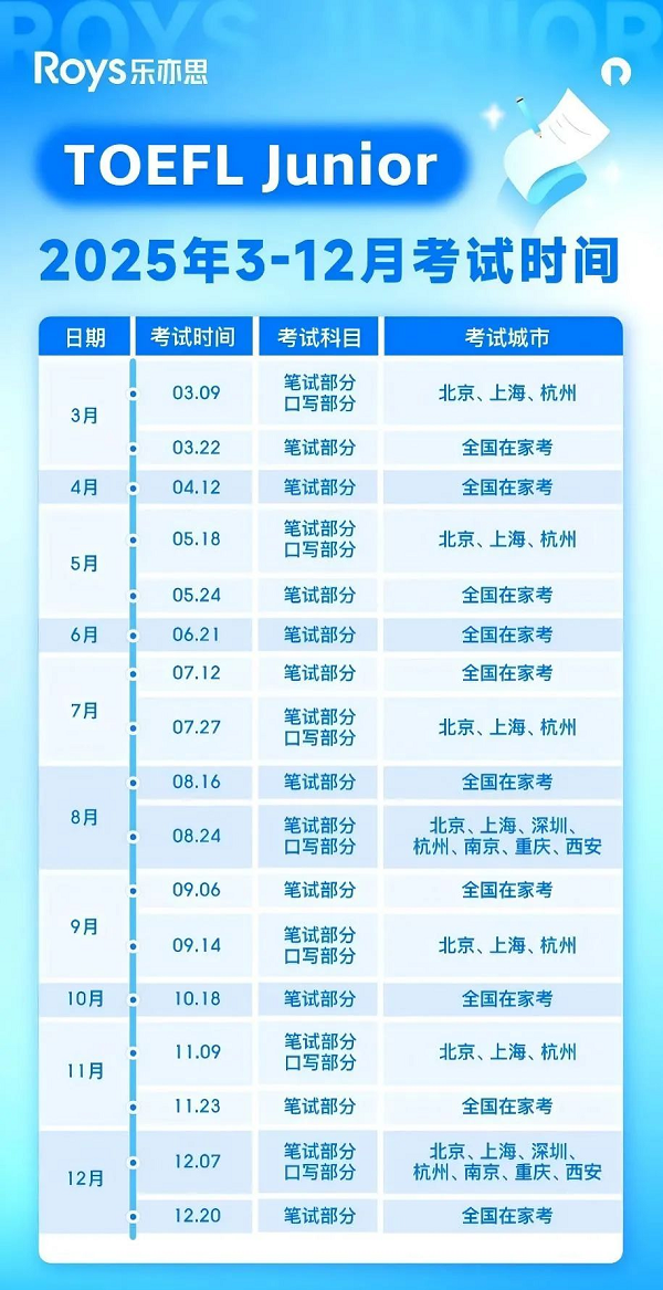 2025年下半年小托福考試時間如下(具體時間還是得以官網和考試中心的通知為準哈):