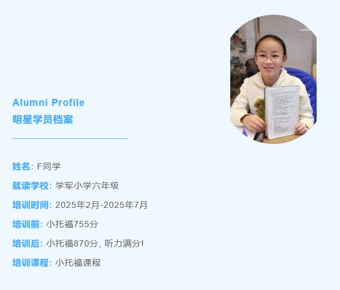 學軍小學六年級的F同學,在2025年2月到7月這段時間參加了培訓。培訓前,他的小托福成績是755分,培訓后直接飆升到870分,聽力還拿了滿分!