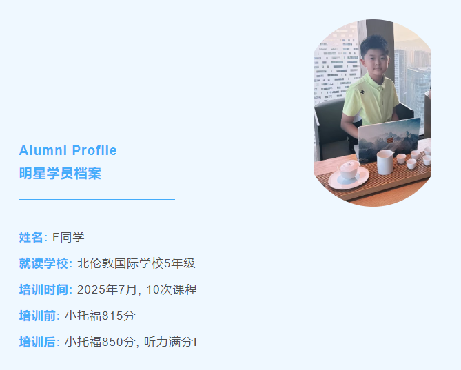 還有一位來自北倫敦國際學校5年級的F同學,在2025年7月上了樂亦思小托福10次課程。培訓前他的小托福成績是815分,培訓后達到了850分,聽力同樣是滿分!