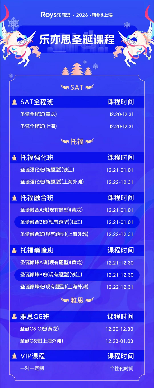 圣誕假期,正是年末沖刺、拉開差距的絕佳時機。如何充分利用這段時間,為SAT 1500+、托福110+、雅思7.0+等高分目標打下堅實基礎?樂亦思特別推出「SAT/托福/雅思圣誕專項課程」,助你一臂之力!