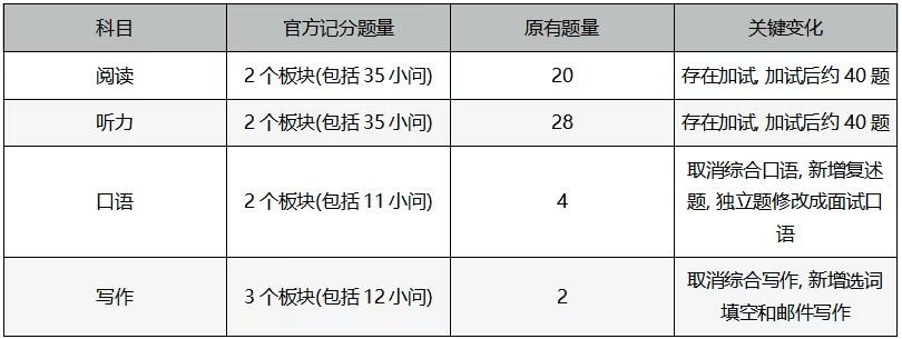這種自適應(yīng)機(jī)制對考生的首輪答題穩(wěn)定性提出了更高要求,但同時也優(yōu)化了考試體驗,避免了考生在某一題上耗時過長。此外,四個單項的題量也有所調(diào)整,閱讀和聽力各35題,寫作12題,口語11題。