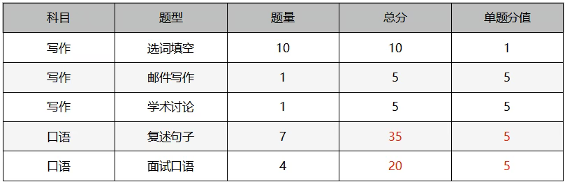 最后,是大家最為關(guān)心的分值規(guī)則與分?jǐn)?shù)換算問題。閱讀和聽力共35題,對應(yīng)原始分35分;口語55分,寫作20分。不同題型的分值有所差異,新題型與傳統(tǒng)題型的分值也不盡相同。最終,四科原始分將統(tǒng)一轉(zhuǎn)換為6分制,分?jǐn)?shù)區(qū)間為1-6分,無0分。得到6分制的分?jǐn)?shù)后,再計算四科的平均分,即為考生的最終成績。